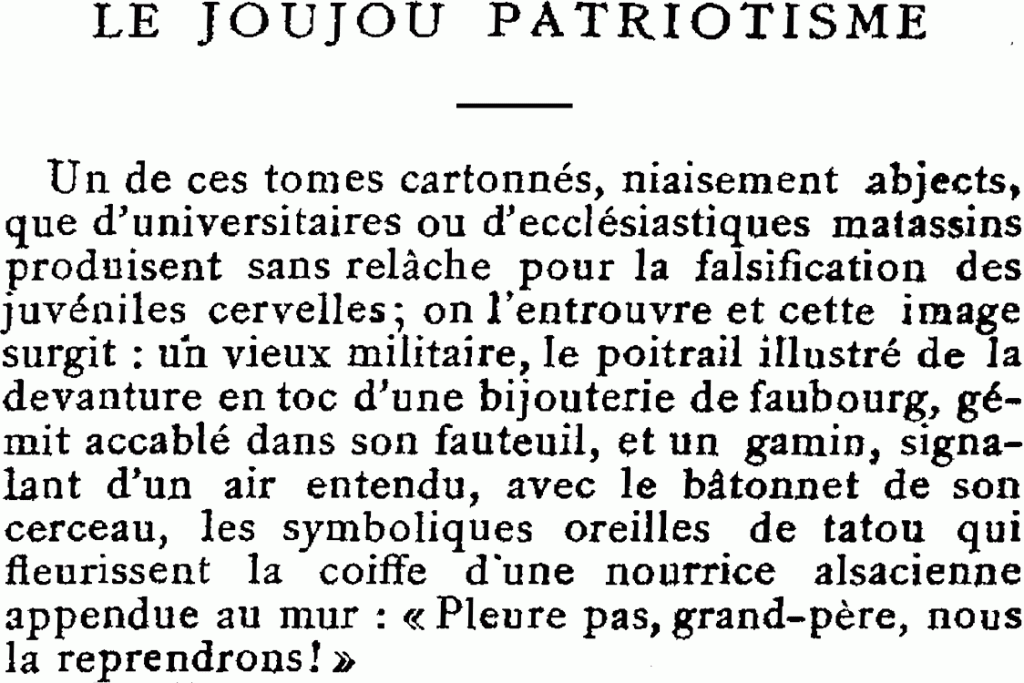 Un de ces tomes cartonnés, niaisement abjects, que d’universitaires ou d’ecclésiastiques matassins2 produisent sans relâche pour la falsification des juvéniles cervelles ; on l’entrouvre et cette image surgit : un vieux militaire, le poitrail illustré de la devanture en toc d’une bijouterie de faubourg, gémit accablé dans son fauteuil, et un gamin, signalant d’un air entendu, avec le bâtonnet de son cerceau, les symboliques oreilles de tatou qui fleurissent la coiffe d’une nourrice alsacienne appendue au mur : « Pleure pas, grand-père, nous la reprendrons ! »
