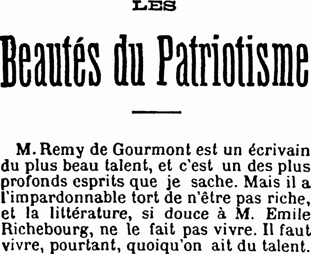 Nous ajouterons maintenant que si, nous aussi, nous eussions été choqués qu’un homme de la valeur de M. de Gourmont ne fût pas patriote, la nouvelle de sa révocation nous aurait ému comme elle nous émeut, et au nom de la seule liberté qui nous soit chère en ce monde, celle d’écrire et de penser, alors comme aujourd’hui, nous nous serions levés pour protester.