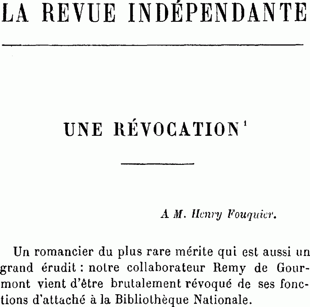 Un romancier du plus rare mérite qui est aussi un grand érudit : notre collaborateur Remy de Gourmont vient d’être brutalement révoqué de ses fonctions d’attaché à la Bibliothèque Nationale.