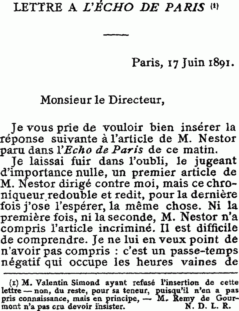 « M. Valentin Simond ayant refusé l’insertion de cette lettre — non, du reste, pour sa teneur, puisqu’il n’en a pas pris connaissance, mais en principe, — M. Remy de Gourmont n’a pas cru devoir insister. »