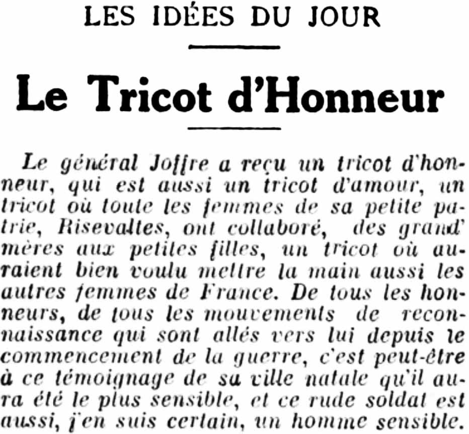 Le général Joffre a reçu un tricot d’honneur, qui est aussi un tricot d’amour, un tricot où toute les femmes de sa petite patrie, Rivesaltes, ont collaboré, des grand’mères aux petites filles, un tricot où auraient bien voulu mettre la main aussi les autres femmes de France. De tous les honneurs, de tous les mouvements de reconnaissance qui sont allés vers lui depuis le commencement de la guerre, c’est peut-être à ce témoignage de sa ville natale qu’il aura été le plus sensible, et ce rude soldat est aussi, j’en suis certain, un homme sensible. Son souci d’épargner la vie de ses troupes, si opposé au gaspillage féroce de vies humaines que pratique l’ennemi, en est une des preuves. Ce n’est pas seulement la raison qui lui conseille cela, c’est la sensibilité. Il pense à l’avenir de la France, il pense à tant de belles jeunesses sacrifiées à la patrie, il pense aussi à ces femmes qui ont pensé à lui et qui lui devront la joie de revoir ceux qui sont partis. C’est pour cela qu’il n’est pas seulement admiré, mais aimé et vénéré. C’est pour cela que l’idée des femmes de Rivesaltes, si jolie et si touchante, a semblé aussi si raisonnable et si juste. Et puis, à courir par ces temps, de bataille en bataille, par ces temps et par tous les temps, on n’est pas sans risquer un peu de sa santé : le tricot le mettra à l’abri des mauvais froids. Et quand même, il le ferait ranger dans une valise, tout simplement, il lui tiendrait encore chaud, ne fusse qu’au cœur.