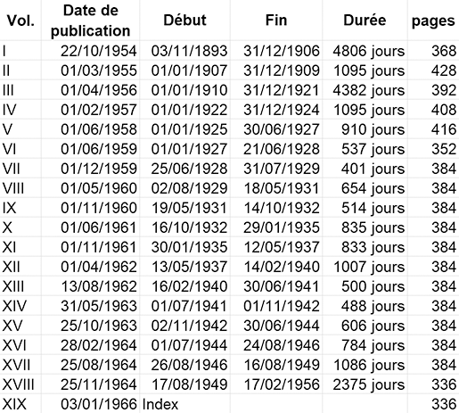 La première édition s’est étalée sur dix-huit volumes publiés sur dix années, du 1er mars 1955 au 25 novembre 1964. L’ensemble représente, selon le site web du Mercure de France, 6 924 pages, ce qui semble exagéré, j’en ai compté 6471.