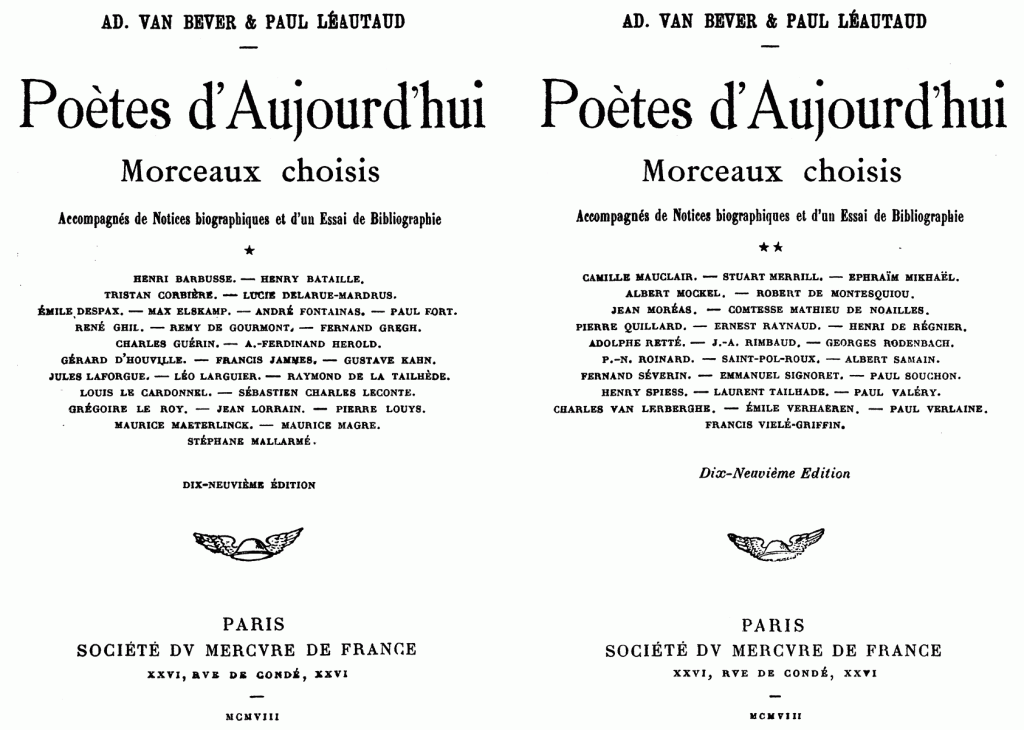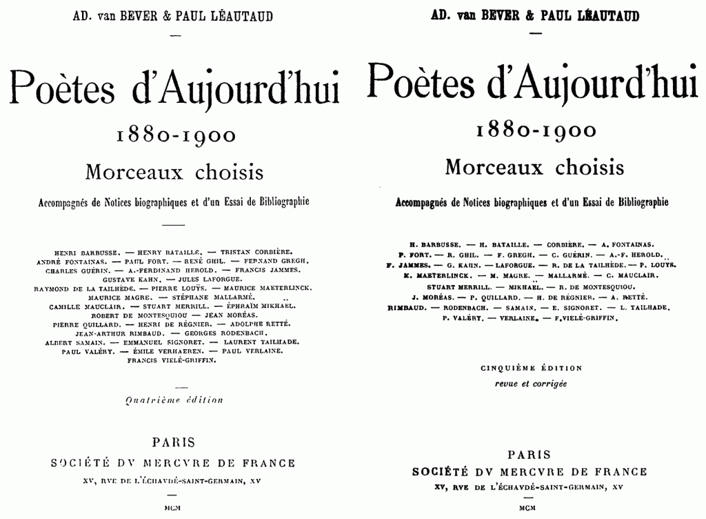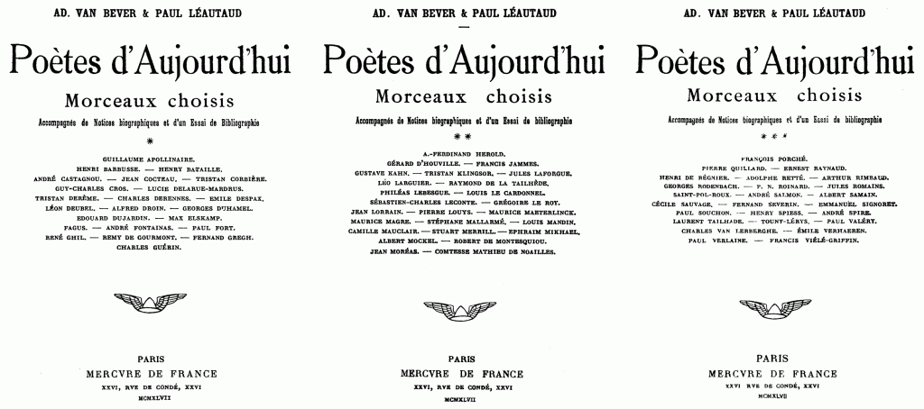 Il y a eu trois éditions des Poètes d’aujourd’hui : 1900, 1908, 1930 (datée 1929), avec parfois des réimpressions intermédiaires en 1913, 1918, 1947…