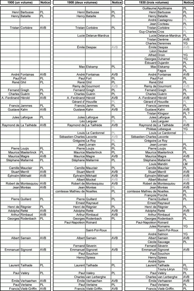 Henri Barbusse (PL), Henry Bataille (PL), Tristan Corbière (AVB), André Fontainas (AVB), Paul Fort (AVB), René Ghil (PL), Fernand Gregh (PL), Charles Guérin (PL), André-Ferdinand Hérold (AVB), Francis Jammes (PL), Gustave Kahn (AVB), Jules Laforgue (PL), Raymond de La Tailhède (AVB), Pierre Louÿs (PL), Maurice Maeterlinck (PL), Maurice Magre (AVB), Stéphane Mallarmé (PL), Camille Mauclair (PL), Stuart Merrill (AVB), Éphraïm Mikhaël (AVB), Robert de Montesquiou (AVB), Jean Moréas (AVB), Pierre Quillard (PL), Henri de Régnier (PL), Adolphe Retté (AVB), Arthur Rimbaud (AVB), Georges Rodenbach (PL), Albert Samain (AVB), Emmanuel Signoret (AVB), Laurent Tailhade (PL), Paul Valéry (PL), Émile Verhaeren (AVB), Paul Verlaine (PL), Francis Vielé-Griffin, (AVB).