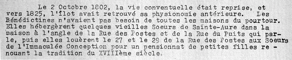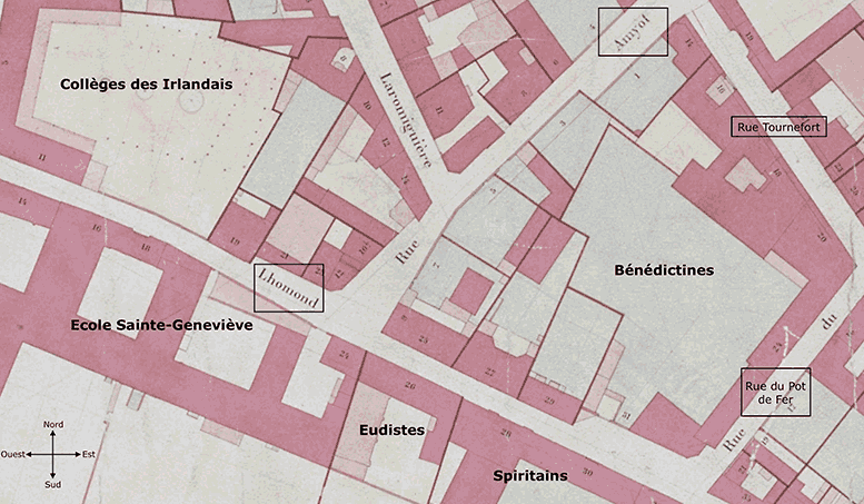 Le coin sud-est, au niveau du 25 rue Lhomond, est, à l’époque, occupé par un bâtiment appartement aux Bénédictines du Saint-Sacrement qui, entre 1808 et 1825, se sont rendues propriétaires de tout l’îlot Lhomond/Amyot/Tournefort/Pot de fer, voir (I) le document détaillant l’acquisition4 et, ci-après (II) l’extrait des propos d’Albert Laprade dans sa conférence du 30 avril 1960(5).