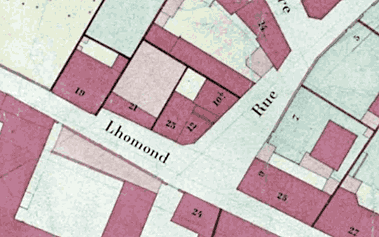 ➤ (« …rue Amyot … au coin de la rue Lhomond » oui, mais de quel coin s’agit-il ? Est-ce le coin sud-est ? Le plan parcellaire3 de la fin du XIXe nous indique la configuration de l’endroit, précisément à l’époque où Paul Léautaud résidait dans le quartier :