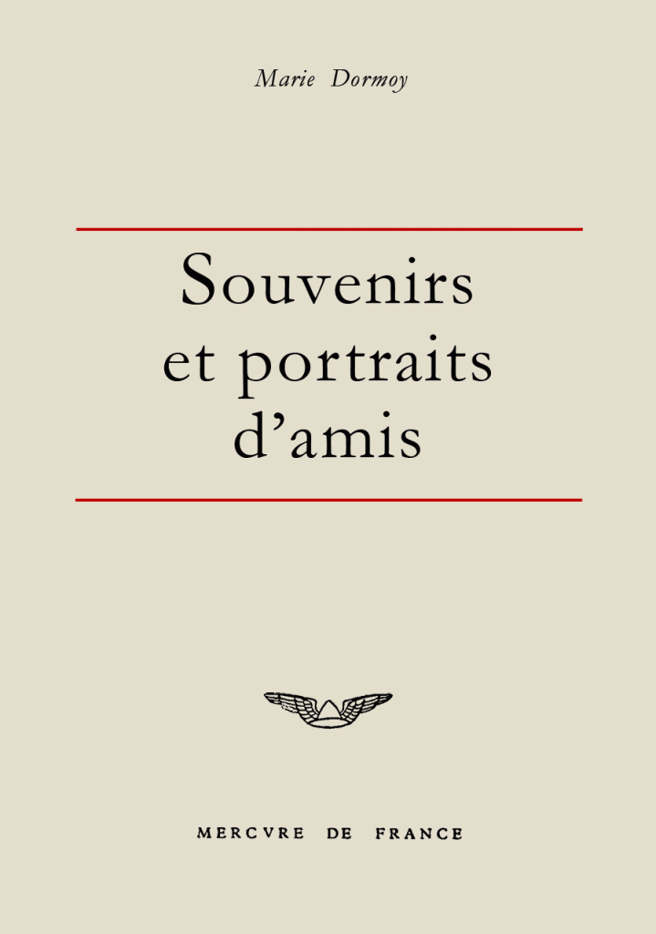 En 1963, Marie Dormoy a publié au Mercure de France un volume, Souvenirs et portraits d’amis. Ces amis sont Lucien Michelot, André Suarès, Romain Rolland, Marcel Dupré, Antoine Bourdelle, Auguste Perret, Le chat Miton, Ambroise Vollard, Aristide Maillol, Jacques Doucet, Darius Milhaud, Paul Valéry, André Gide, Madeleine Gide, Cécile Sauvage, Olivier Messiaen et Paul Léautaud.