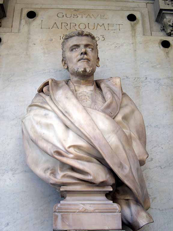 Gustave Larroumet (1852-1903, à 51 ans), est agrégé de grammaire en 1875 et donc professeur — en province d’abord, puis au Lycée Henri-IV, réservé aux meilleurs. Gustave Larroumet soutient une thèse de doctorat sur Marivaux et enseigne à la Sorbonne tout en publiant plusieurs ouvrages d’érudition littéraire essentiellement axés sur les auteurs dramatiques. Gustave Larroumet est reçu à l’Académie des Beaux-Arts en 1891 avant d’en devenir le secrétaire perpétuel en 1898.