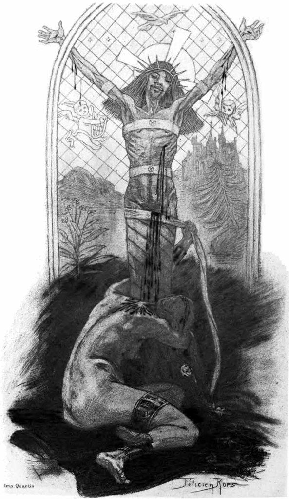 44 Rodolphe Darzens, L’Amante du Christ, scène évangélique en vers représentée au Théâtre-Libre d’André Antoine le 19 octobre 1888. Le texte est paru la veille chez Alphonse Lemerre, précédé d’un frontispice de Félicien Rops en héliogravure, retouchée à l’aquatinte et d’une préface de l’archéologue Eugène Ledrain, 48 pages.