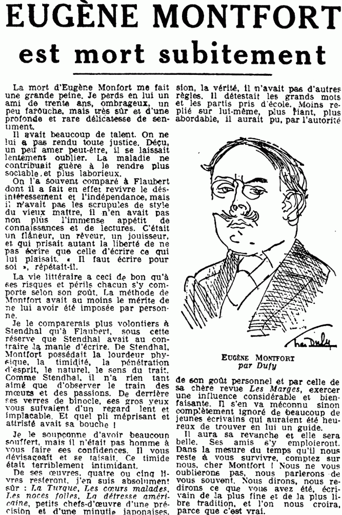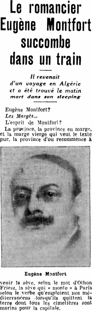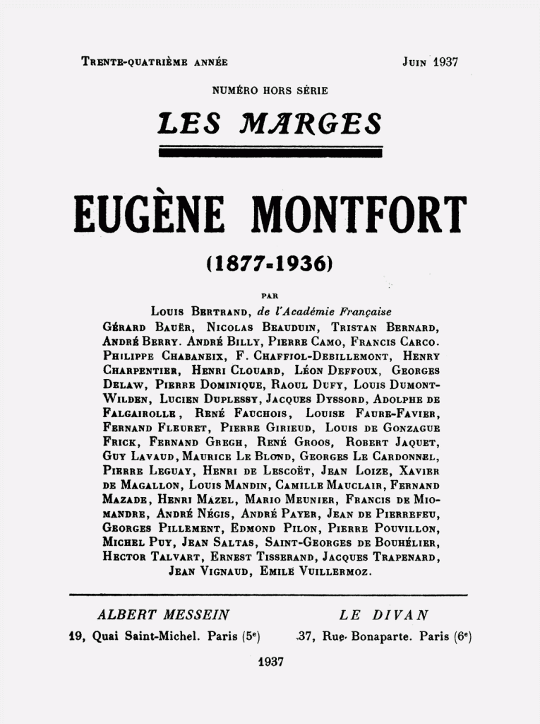 Le destin a voulu qu’Eugène Montfort soit mort quelques jours avant le numéro de décembre de ses Marges qui devait être le dernier, et le jour même où ses amis l’attendaient pour dîner ensemble, comme ils en avaient l’habitude tous les mois. Il aura cessé de vivre en même temps que cessait de paraître la gazette littéraire qu’il avait fondée il y a trente-deux ans. Du moins a-t-il eu le bonheur de revoir, une dernière fois, la ville qu’il préférait entre toutes, et de s’attabler à la terrasse d’un bar, sur le Vieux-Port, devant un verre de vin de Cassis, ému au souvenir de ses personnages qui avaient foulé ce même quai, naguère : Colette et lui-même, Diane et Didier, et Guy Joli, Casteldor et Giulia… Sa disparition n’a pas fait grand bruit. Les éloges lui furent mesurés, comme s’il se fût agi d’un romancier entre tant de romanciers. Il n’était d’aucune académie, non plus que d’aucune chapelle, et ses livres n’atteignaient pas les gros tirages. Ils avaient pourtant tout ce qu’il faut pour plaire à des dizaines de milliers de lecteurs ; pour la plupart, ils eussent fait merveille sur l’écran. Un bref roman d’un de ses amis, Louis Codet, qu’il publia et révéla dans les Marges, en 1918, porte ce titre : César Capéran ou la tradition, qui devrait être celui de l’essai qu’on écrira un jour sur son œuvre, qui n’est pas nombreuse, mais de qualité : Eugène Montfort ou la tradition. Il débuta, naturiste, par des poèmes en prose, où il chantait ses émois passionnés. C’était un cœur tendre et aimant, qui fut déçu, et qui resta vierge, même quand il crut trouver l’affection. Comme tous les timides, il parlait peu, ne se livrait pas, ne se liait guère. Mais il s’intéressait à tout, prompt à saisir les singularités des êtres et le pittoresque des choses. Il aimait la vie, avidement, et il en a joui de même.