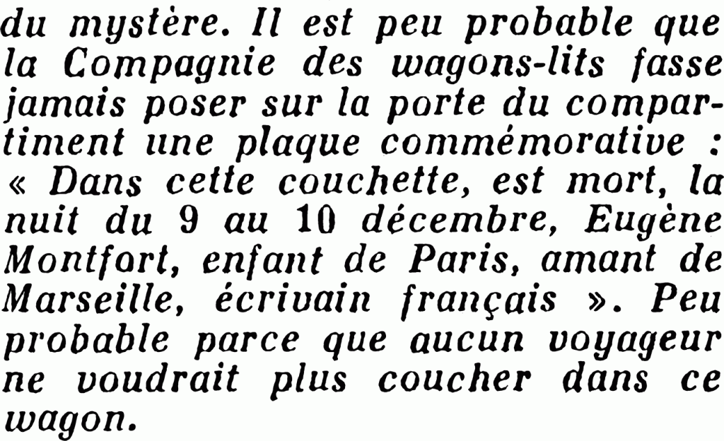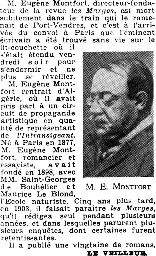 Dans la rubrique « La vie féminine et mondaine » du Figaro du dimanche treize (page deux), l’affaire est traitée en moins de 25 lignes : « Eugène Montfort, l’écrivain connu […] est mort l’autre nuit dans le train. » Par « l’autre nuit », comprendre avant-hier, vendredi onze au matin. « L’œuvre que laisse Montfort comprend nombre de bons romans […] il fut longtemps de nos collaborateurs. Sa disparition soudaine nous laisse de profonds regrets. » Le treize est jour de chance, on ne va pas gâcher ça pour si peu. Et puis, en Angleterre, Georges VI est proclamé roi. Heureusement Guermantes (Gérard Bauër), dans Le Figaro rattrapera l’affaire le lendemain par une jolie demi-colonne en une. Ce n’est pas le onze que Guermantes date la mort d’Eugène Montfort mais de « la nuit du 9 au 10 ».
