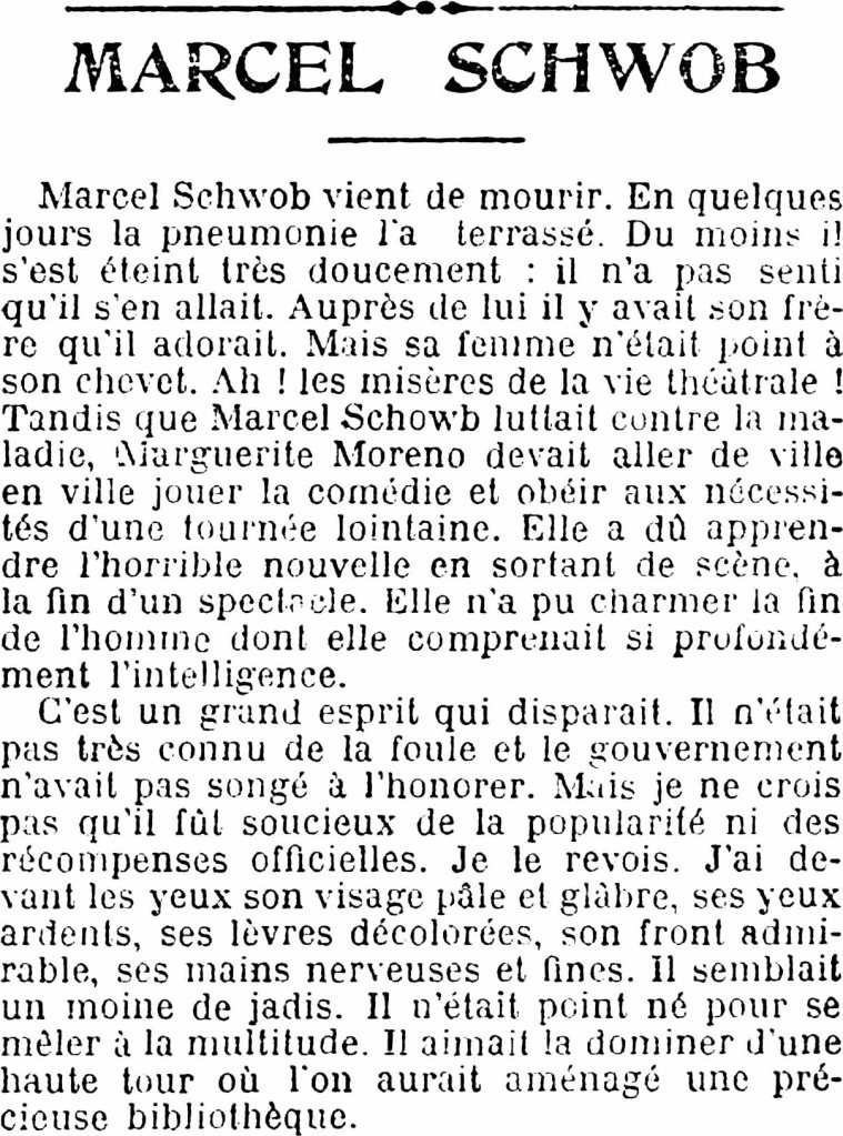 6 Gil Blas du 27 février 1905, page une, milieu de la dernière colonne et haut de la page suivante, sur la signature de Fernand Nozière : « Marcel Schwob vient de mourir. En quelques jours la pneumonie l’a terrassé. Du moins il s’est éteint très doucement : il n’a pas senti qu’il s’en allait. Auprès de lui il y avait son frère qu’il adorait. Mais sa femme n’était point à son chevet. Ah ! les misères de la vie théâtrale ! Tandis que Marcel Schowb luttait contre la maladie, Marguerite Moreno devait aller de ville en ville jouer la comédie et obéir aux nécessités d’une tournée lointaine. Elle a dû apprendre l’horrible nouvelle en sortant de scène, à la fin d’un spectacle. Elle n’a pu charmer la fin de l’homme dont elle comprenait si profondément l’intelligence. […] » Un reproduction de cet article peut m’être demandée.