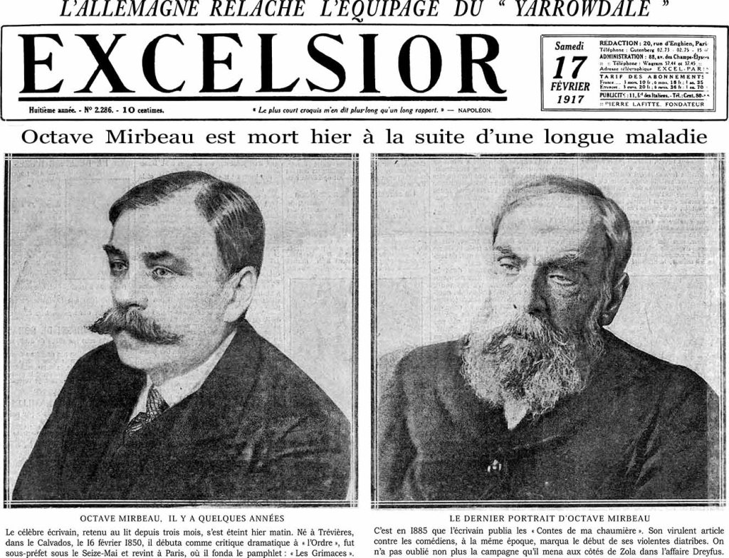 Excelsior publie ce matin deux portraits de Mirbeau, l’un à une époque que je ne le connaissais pas encore, l’autre, ces derniers temps2. Celui-ci est vraiment effroyable, il n’y a pas d’autre mot. Le Mirbeau que j’ai vu, lors de ma visite à Triel3, sous la conduite du jeune George Besson4, dans les premiers mois de 1914(5), si je ne me trompe, (quel dommage que le premier feu de mon histoire avec Mme Caysac m’ait fait négliger de noter par le détail cette visite), ce Mirbeau-là était déjà bien abîmé. Encore du feu dans le regard, de la vie ironique et mordante dans la bouche, le bon rire vengeur de l’observateur sarcastique. Tandis que le Mirbeau de ce dernier portrait ! Oui, effroyable, avec cette barbe de vieillard, et surtout, surtout ces yeux mi-clos, sans regard. Je me dis que le contraste entre ces deux portraits lui aurait peut-être plu, s’il avait pu les voir. D’un côté, le bel homme, bien vivant, aimant la vie et en jouissant. De l’autre, celui qui paie tous les plaisirs passés6.