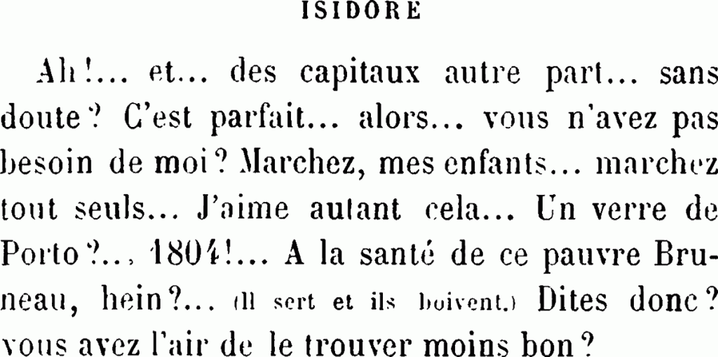 29 Octave Mirbeau, Les Affaires sont les affaires, comédie en trois actes dédiée à Jules Claretie et représentée à la Comédie-Française le vingt avril 1903. L’édition de la pièce en volume est parue chez Charpentier la même année sans date plus précise mais vraisemblablement après la première. On peut noter que le texte (acte II, scènes X et XI, pages 169 et 183 de l’édition originale) porte « Un verre de Porto ».