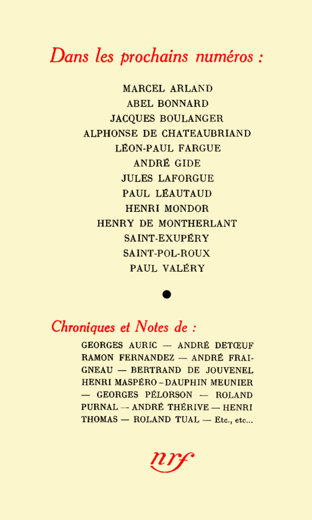 75 En compagnie de Marcel Arland, Abel Bonnard, Jacques Boulanger, Alphonse de Chateaubriand, Léon-Paul Fargue, André Gide, Jules Laforgue, Paul Léautaud, Henri Mondor, Henry de Montherlant, Saint-Exupéry, Saint-Pol-Roux, Paul Valéry. Et des chroniques et notes de Georges Auric, André Detœuf, Ramon Fernandez, André Fraigneau, Bertrand de Jouvenel, Henri Maspéro, Dauphin Meunier, Georges Pélorson, Roland Purnal, André Thérive, Henri Thomas, Roland Tual, etc.
