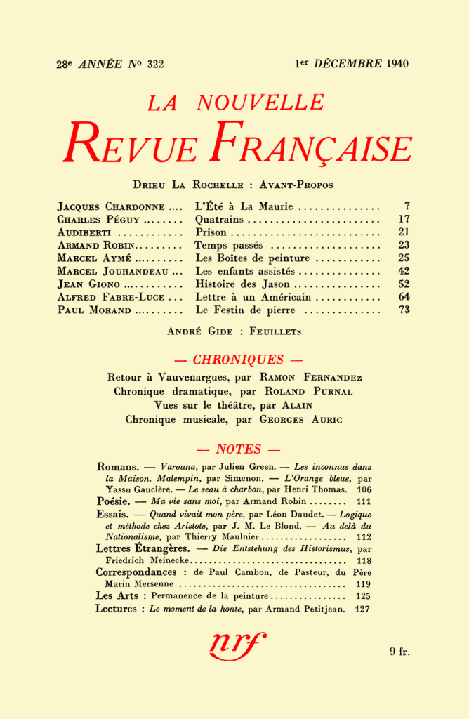 17 Comme de nombreux journaux et revues, comme le Mercure, La NRF avait cessée de paraître après le numéro de juin 1940.