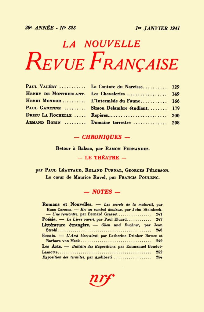 33 Le numéro suivant, de janvier 1941, ne contiendra aucun texte d’André Gide mais, en quatrième de couverture, une annonce de « Feuillets d’André Gide » pour le numéro de février. Ce sera la dernière parution d’André Gide dans La NRF avant sa mort en février 1951.