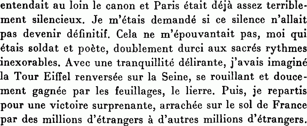 82 « Sous le Dôme » (celui des Invalides), paru dans La NRF de mars, pages 492-496. Il faut vraiment avoir du temps à perdre parce que c’est la guerre pour s’attarder sur ces cinq pages mais en effet : « Ce grand silence, cette grande mort me rappelaient encore un autre silence. En juillet 1918, j’étais arrivé pour quelques heures à Paris, accompagnant un général étranger. […] Puis, je repartis pour une victoire surprenante, arrachée sur le sol de France par des millions d’étrangers à d’autres millions d’étrangers. »