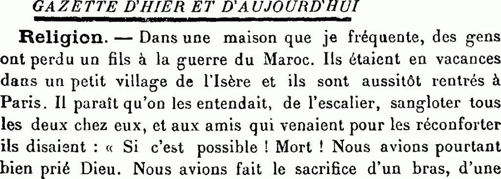 Dans une maison que je fréquente, des gens ont perdu un fils à la guerre du Maroc6. Ils étaient en vacances dans un petit village de l’Isère et ils sont aussitôt rentrés à Paris. Il paraît qu’on les entendait, de l’escalier, sangloter tous les deux chez eux, et aux amis qui venaient pour les réconforter ils disaient « Si c’est possible ! Mort ! Nous avions pourtant bien prié Dieu. Nous avions fait le sacrifice d’un bras, d’une jambe… Nous espérions qu’il nous entendrait. Mais tout, Seigneur ! tout !… » Ainsi, pour ces gens, Dieu est vraiment un personnage auquel on s’adresse, avec lequel on marchande, on négocie, on transige, lui cédant ceci pour avoir cela. Pour eux, Dieu pouvait décider à l’égard de leur fils ou seulement un membre emporté, ou la mort. Quelle profondeur de bêtise !