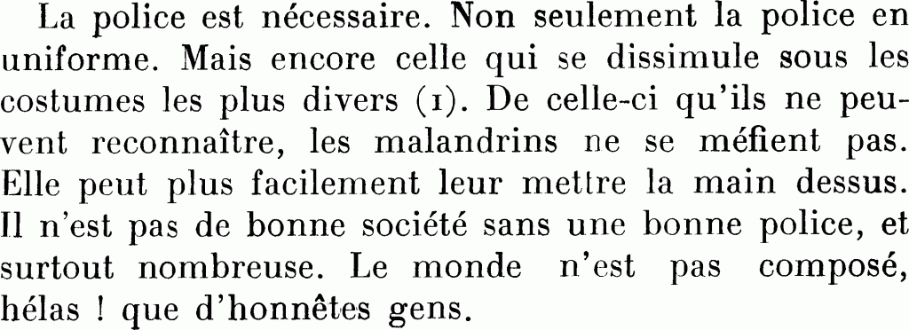 La police est nécessaire. Non seulement la police en uniforme. Mais encore celle qui se dissimule sous les costumes les plus divers21. De celle-ci qu’ils ne peuvent reconnaître, les malandrins ne se méfient pas. Elle peut plus facilement leur mettre la main dessus. Il n’est pas de bonne société sans une bonne police, et surtout nombreuse. Le monde n’est pas composé, hélas ! que d’honnêtes gens.