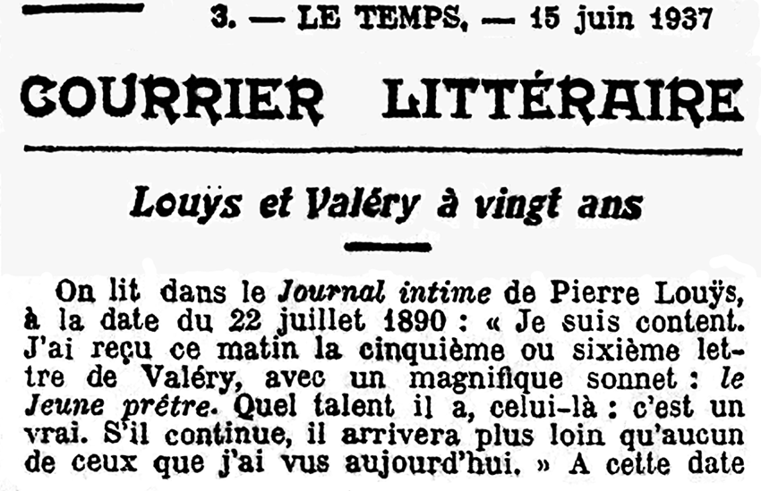 Mais ce n’est pas seulement pour protester une fois de plus contre le trafic de choses que leur nature intime devrait faire mettre extra commercium que je me suis permis de m’adresser aux directeurs, et donc aux lecteurs du Temps. Je tiens à rectifier sur un point qui m’importe l’article d’Émile Henriot. Il y est dit que Pierre Louis « s’était fait donner par M. Paul Valéry (en 1919) les originaux de ses propres lettres, pour les intercaler avec celles qu’il avait reçues de son ami »… Henriot ne pouvait pas savoir que ces lettres (qui figurent parmi les miennes au dossier de la prochaine vente) n’ont été par moi que prêtées à mon ami dans les circonstances suivantes : Pierre, avec une juste amertume, pensait que le véritable visage de son esprit et la substance profonde de sa vie d’artiste étaient méconnus du public : il prenait devant moi sa jeunesse à témoin ; il invoquait toutes ces magnifiques lettres qu’il m’avait écrites en 1890 et qui avaient édifié notre amitié. Le souci de laisser après soi une idée de lui-même qui fût incontestable et conforme à la noblesse de son idéal le possédant et le préoccupant de plus en plus, il conçut le dessein de faire connaître par un livre ses premières années de poète. Ce livre aurait eu pour titre : À dix-neuf ans.