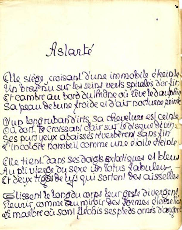 Le recueil de poésies Astarté est d’abord paru en 1891 à compte d’auteur puis l’année suivante à la Librairie de l’art indépendant, en cent exemplaires. L’illustration ci-dessus est un autographe indépendant de l’édition. Le poème donnant le titre au recueil est dédié à André Gide mais on peut penser qu’il aurait davantage convenu à Paul Valéry : « Elle siège, croisant d’une immobile étreinte / Un bras nu sur les seins verts spirales d’or fin / Et cambre au bord du thrône où rêve le dauphin / Sa peau de lune froide et d’air nocturne peinte. »