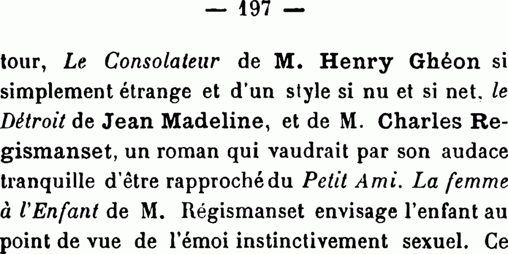 Nous citerons encore […] de M. Charles Regismanset, un roman qui vaudrait par son audace tranquille d’être rapproché du Petit Ami. La femme à l’Enfant de M. Régismanset envisage l’enfant au point de vue de l’émoi instinctivement sexuel. Ce n’est point un livre obscène ou curieux, c’est une œuvre troublante et douce. Pas même le regard de Stendhal amoureux de sa mère Henriette Beyle « alors qu’elle saute par-dessus le lit de son fils pour atteindre plus vite le sien » ou de sa tante Mme Camille Gagnon dont il avait entrevu, alors qu’elle descendait de voiture, « la peau blanche à deux doigts au-dessus du genou ». M. Régismanset a composé un roman plus subtil, plus équivoque et plus profond.