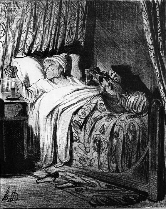 J’ai trouvé autrefois une lithographie de Daumier qui est tout le portrait de Léautaud. Je veux en donner la référence et dire que, et de l’aveu même de Léautaud, il n’existe pas de représentation de lui plus fidèle. Il s’agit de la lithographie terminale (no 5 je crois) de la petite suite : « La journée d’un célibataire ». Il est là dans son lit, avec son couvre-lit et ses chiens et chats, à l’instant où sa journée se termine, alors que tous ensemble ils vont aborder au sommeil. Léautaud, le bonnet de coton en tête, va poser l’éteignoir sur la bougie. La béatitude consciente et plénière paraît sur son visage. Ainsi pourra-t-on repérer cette image dans quelque cabinet d’estampes et la joindre plus tard à son iconographie21 !