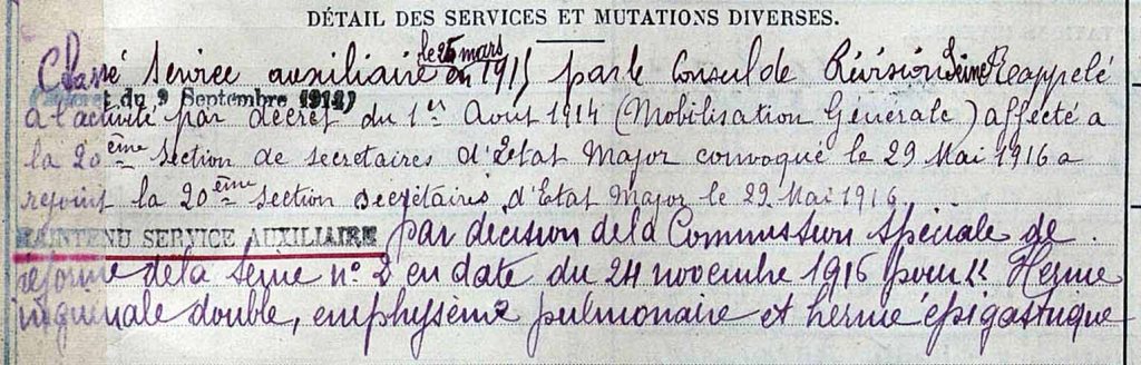 Nous connaissons aussi quelques détails administratifs grâce à un document militaire conservé aux archives de la Mairie de Paris consultables à l’adresse https://is.gd/yiRpmw dont voici un fragment :