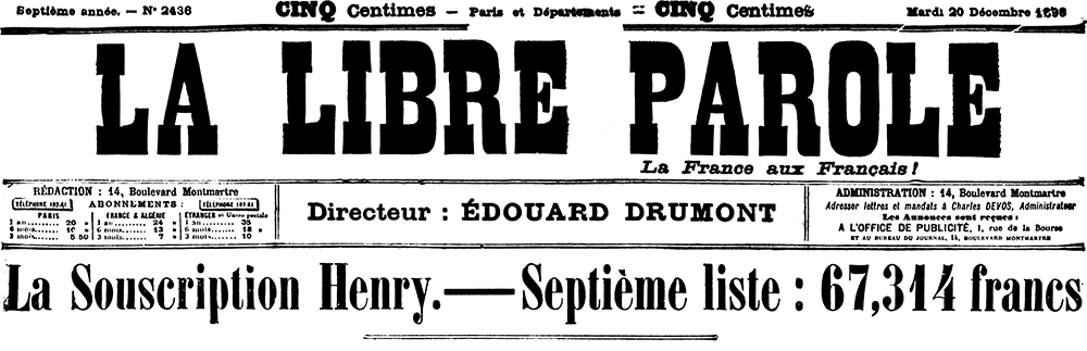 Un mois durant, aux fenêtres de La Libre parole, un transparent annonça au peuple de Paris les sommes souscrites en l’honneur du faux et pour la plus grande gloire de l’Armée, de la Sainte-Église et de la Patrie. Un mois durant la déshonorante enseigne flamboya, provoquant à la haine et au meurtre des juifs et généralement de quiconque ne confessait point sans aucune restriction l’évangile antisémite et soldatesque.