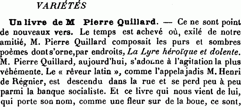 On comprend que Paul Léautaud ne soit plus l’ami de Pierre Quillard ! Le texte « Un livre de pierre Quillard » est paru à la fin de la revue sous le titre de rubrique : « Variétés », après les « Lettres tchèques » et avant les « Publications récentes » :
