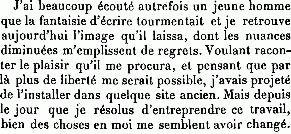 Tant je désespère croiser une intelligence qui les comprenne, c’est presque pour moi seul que j’écris ces lignes. J’aurais aimé les dédier à quelqu’un qui les pût ressentir ; mais de ceux qui m’entourent et de qui me choque la trop bonne santé, aucun ne m’a paru digne du don de cet essai, et quant à celui-là de qui je veux repeindre ici l’impression, peut-être aujourd’hui il raillerait, et j’ai préféré fuir, en oubliant son nom, la tristesse née pour moi à ce sourire.