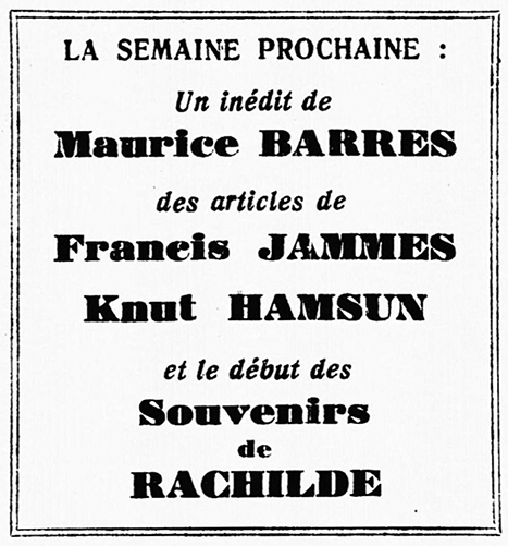 Vallette1 me demande ce matin si j’ai toujours l’article que Rachilde2 a écrit sur moi dans L’Éclair, et dont elle a besoin.