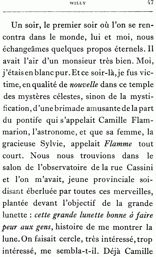 Willy53, l’à peu près grand homme54, est le type du spirituel viveur parisien, le plus naïf et le plus doux des hommes. La première fois que Rachilde, jeune fille en blanc pur, le rencontra dans le monde, ce fut dans le salon de l’observatoire de la rue Cassini55, où pontifiait, devant la grande lunette, l’astronome Camille Flammarion.