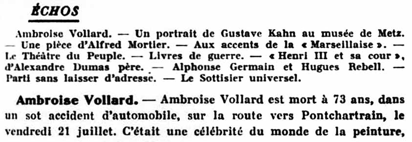 Ambroise Vollard est mort à 73 ans, dans un sot accident d’automobile, sur la route vers Pontchartrain, le vendredi 21 juillet. C’était une célébrité du monde de la peinture, comme marchand de tableaux, pour ses curieux débuts dans cette carrière et la belle fortune qu’il y avait faite. Né à la Réunion, venu en France pour faire son droit, il s’intéressa à la peinture, eut la devination de l’avenir de peintres, à cette époque, ou fort critiqués ou peu connus, comme Renoir et Cézanne, Bonnard et Vuillard, bien d’autres, achetant leurs toiles, les emmagasinant dans sa boutique et son sous-sol de la rue Laffitte, les deux bientôt célèbres dans le monde des amateurs. Un beau jour, la célébrité de tous ces artistes fit sa fortune. Ambroise Vollard n’était pas que ce marchand de tableaux à l’heureuse devination. Il était aussi un écrivain d’un merveilleux talent fait du naturel le plus accompli, d’un art extrême pour présenter ses personnages, au point que lorsqu’on le lit, on croit voir et entendre les gens dont il parle, amusé en même temps par tous ses traits malicieux. Ses livres sur Renoir, Cézanne, Degas, sont d’étonnantes réussites dans ce genre et on leur a souvent emprunté pour ce qui a été écrit sur ces peintres. Il était également éditeur de livres d’art de très grand luxe qu’il mettait des années à établir, l’illustration des textes confiés à des peintres comme Bonnard, Dufy, Roussel, Picasso, Rouault, Degas, Émile Bernard, Laprade, des sculpteurs comme Aristide Maillol. On peut citer : Parallèlement, Daphnis et Chloé, Les Réincarnations du Père Ubu, Sagesse, Les Fêtes galantes, La Belle Enfant, L’Odyssée, Gaspard de la nuit, L’Imitation, etc. Sa mort en laisse en chantier quelques-uns dont on se demande ce qu’ils deviendront. Ambroise Vollard a fait également des conférences, jusqu’en Amérique, sur les artistes qu’il a connus. L’homme était original, pittoresque, charmant, simple, plein de malice, de la plus grande courtoisie, obligeant et bienfaisant sans le répandre, le premier à rire quand on lui faisait des compliments sur ses qualités d’écrivain. Sachant qu’il allait mourir, il a encore montré cette bonté cachée en lui par des paroles de pardon et de résignation qui touchent profondément. Son dernier livre : Souvenirs d’un Marchand de tableaux, est une mine de renseignements, de portraits, d’anecdotes sur des peintres, des écrivains, des amateurs d’art qu’il avait connus depuis ses débuts jusqu’à ce jour. Il travaillait à un livre de souvenirs personnels sur son enfance et sur sa jeunesse. Ses obsèques ont eu lieu le 28 juillet à Sainte-Clotilde, à deux pas de son hôtel de la rue de Martignac, un vrai musée.