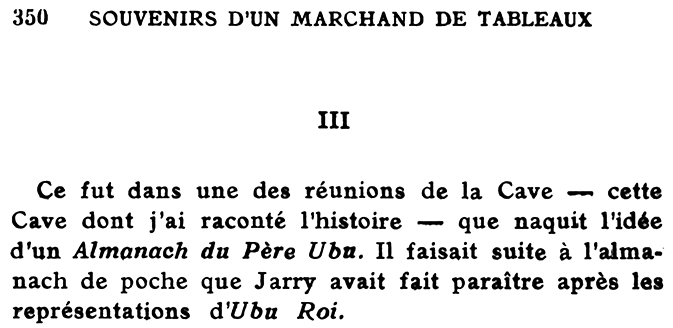 65 Chapitre XII : « Ambroise Vollard éditeur et auteur », titre III, à partir de la page 350. Il est vrai que la lecture de ces pages est assez vite abandonnée, au milieu de la première pour les plus patients des lecteurs. Il n’en est pas toujours de même, comme les pages 118-119, décrivant les logements d’Alfred Jarry.